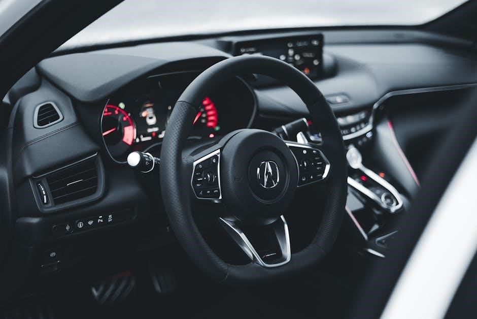 The 2015 Acura TLX features an intuitive touchscreen interface for navigation‚ audio‚ and climate controls. The system offers customizable home screens and shortcuts for frequently used functions. Menu navigation is designed for ease of use‚ with clear icons and logical grouping of features. The touchscreen supports multi-touch gestures‚ such as swiping and pinching‚ for seamless interaction. This system enhances your driving experience by providing quick access to essential controls while minimizing distractions on the road.